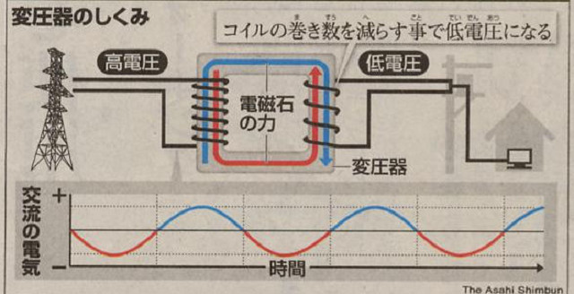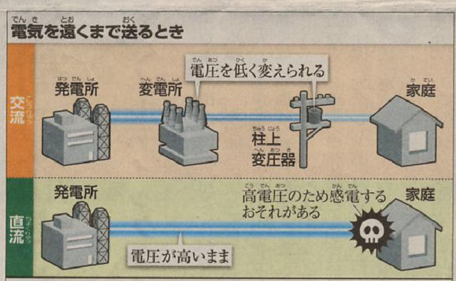 直流方式は電圧降下のため、半径3キロ程度しか送電できなかったが、交流だと、高い電圧で送電して、どこでも100ボルトに下げられる。