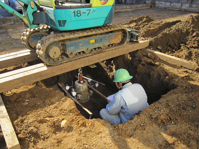 まず平板載荷試験を行い想定の地耐力が有るかを確認します。