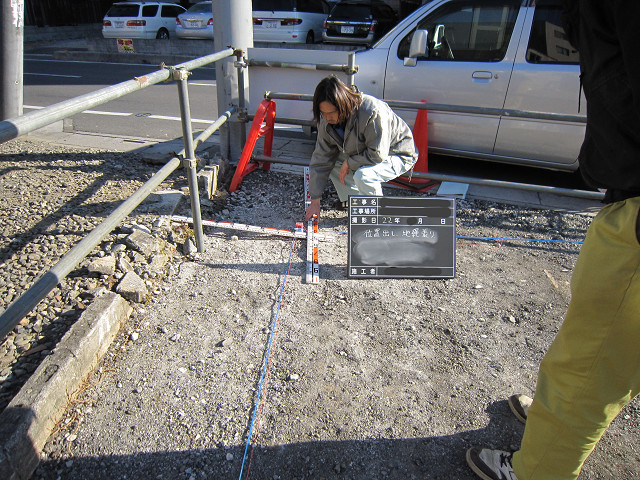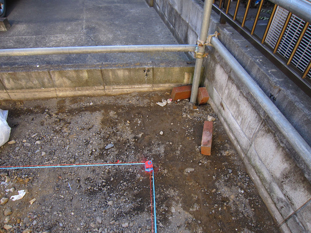 前面道路はレベル(水平を出す機械)で確認すると目視では水平に見えますが僅かに勾配になっていました。