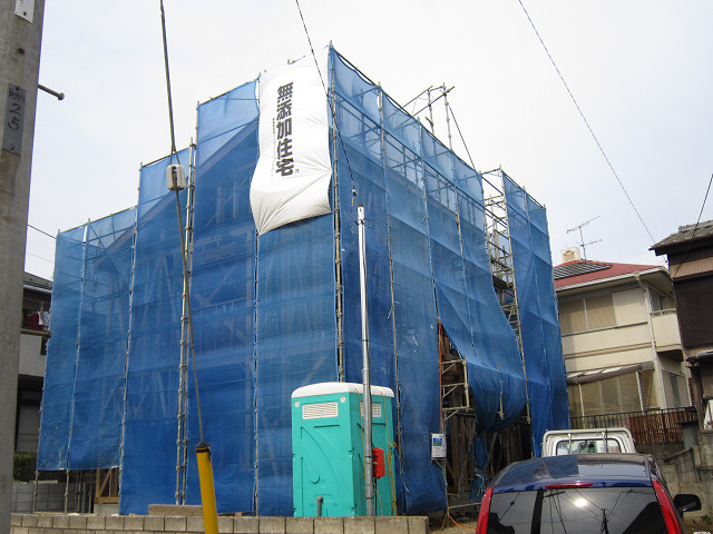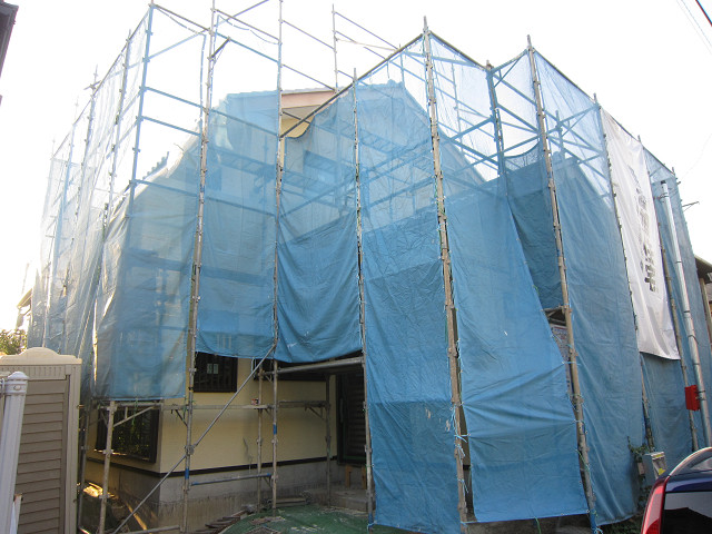塗り終わっているのですが養生シートが有るのでよく見えませんね。