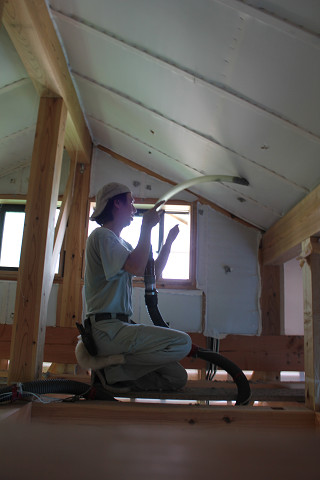 施工しているのを見ていると、空気でセルローズファイバーを充填するので隅々まで断熱材が入るのが分かりますよ。