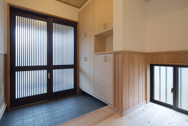 天井は玄関庇と同じ杉板です、腰板は杉板腰上は漆喰