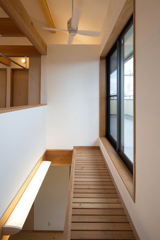 上部は吹き抜けになっており階段に日が差し込んでいます。