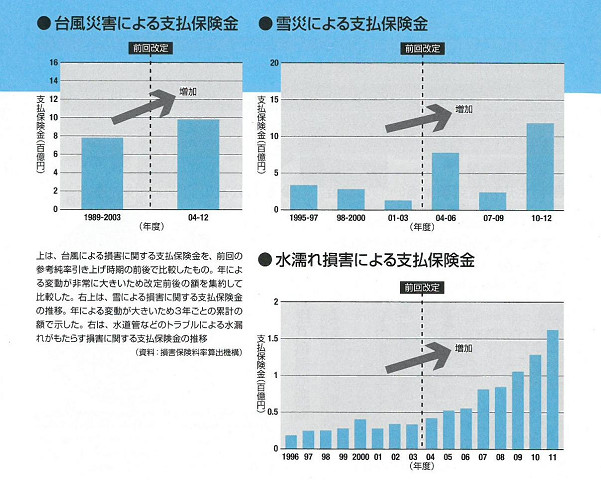 台風による損害、ひょうや雪などによる損害、水道管などのトラブルによる水漏れがもたらす損害への保険金の支払い額が増加していることを、損保科率機構では参考統率引き上げの根拠に挙げている。