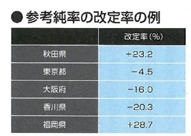 台風が襲来する地域や寒冷地では、改定率の高い県が目立つ。この表と同じ条件の例ではこのほか、沖縄県は29・7%、鹿児島県は29・5%、長崎県と宮崎県は29・o%など、九州・沖縄地方の各県で20%以上の引き上げとなった。