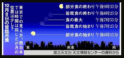 部分食を含め月食がすべて終わるのは午後9時35分ごろ。時刻は各地で同じだが、月の見える位置は東日本のほうが少し高く、