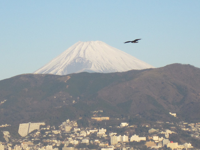 しばらくすると朝日が消えて普通の富士山になりました、飛んでいるのはトンビです。