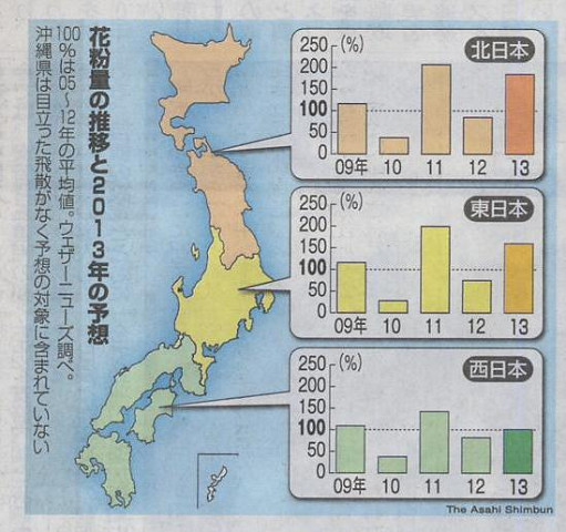 天気が悪いと「表年にしては花粉が少ない年」、良ければ「裏年にしては多い年」になる。実際、西日本は昨夏、好天に恵まれなかったため、今年の花粉量は昨年より約3割多いものの、05~12年までの平均値程度だそうで、表年としては少なめのようです。