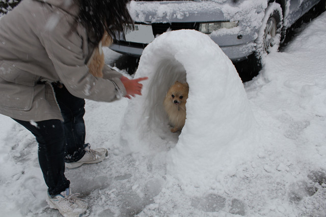 雪が降るとすぐに雪だるまを作る娘がかまくらを作り紋次郎を中に、迷惑そうな紋次郎です。