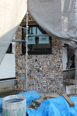 無添加住宅のジュラシックウッドストーンという木の化石を張る予定でしたが、インドネシア政府が輸出を突然禁止したため入手できず同じ物ですが国内に在庫のあった材料で張りました。