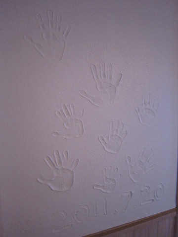 H邸内部の漆喰を塗っている時に記念の手形をつけることを提案しました。