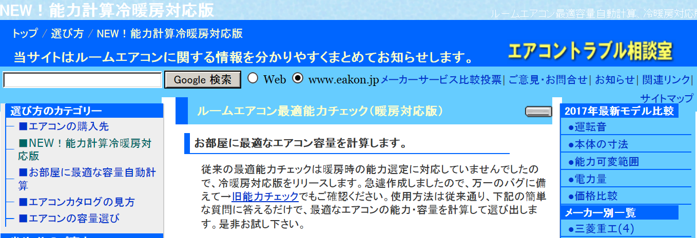 お客様よりエアコンの相談受け、調べたらエアコンの容量を計算できるサイトのありました。