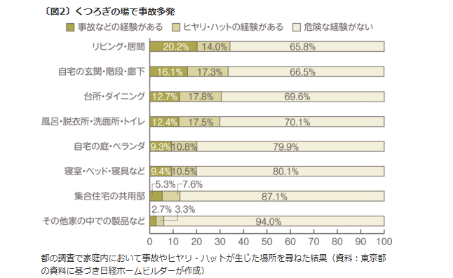 「台所・ダイニング」以外の全ての場所で、転倒は事故やヒヤリ・ハットを招いた最多の事例となっていた。