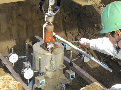 まず平板載荷試験を行い想定の地耐力が有るかを確認します。