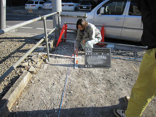 コンクリートの下の30cmの鉄板の沈下量を測っています。