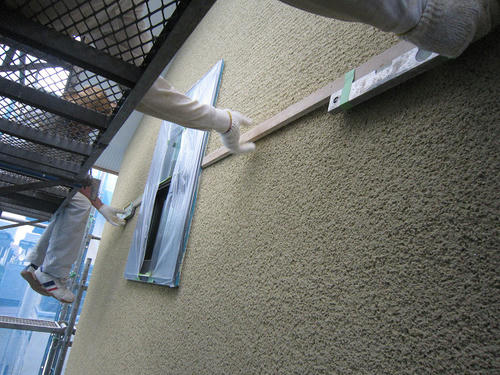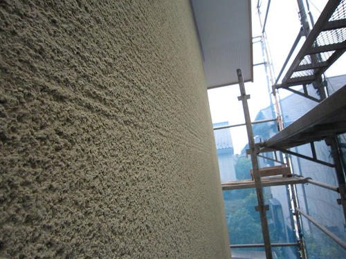そとん壁は横引きの仕上げです、左官屋さんが定規を使って一段一段横引きに金ぐしを引いていきます。