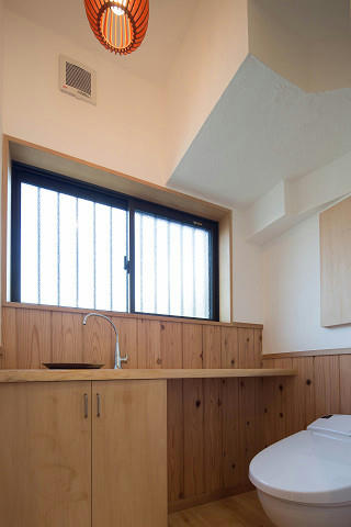 玄関脇のトイレ、照明器具は奥様のチョイスです。
