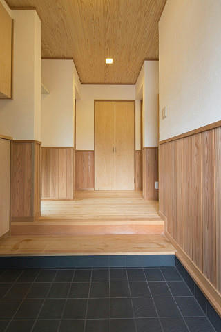 天井は玄関庇と同じ杉板です、腰板は杉板腰上は漆喰