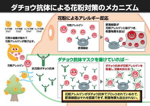 つまり、ダチョウの抗体が花粉アレルゲンに結合(いわゆる抗原抗体反応)し、人の皮膚でのアレルギー反応を抑えると言う事になります。
