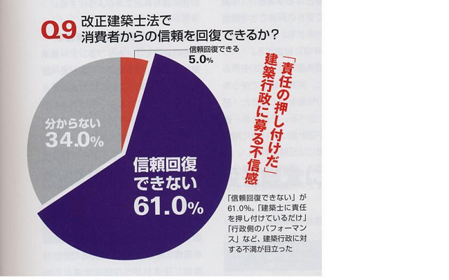日経アーキテクチュアという建築の専門誌(本屋さんでは売っていません)の調査で「改正建築士法で消費者からの信頼を回復出来るか?」との問いに建築関係者の61.0%が信頼回復できないとの解答、私もそう思います。