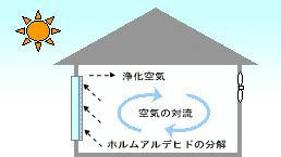 これを居室の外部に面する窓ガラスの内側に塗布することによりホルムアルデヒドを分解除去し、居室内のホルムアルデヒド濃度を0.1㎎/m3以下に保つシステムです。