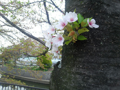 枝の桜はほぼ散りましたが幹に咲いている桜はまだ頑張っています。