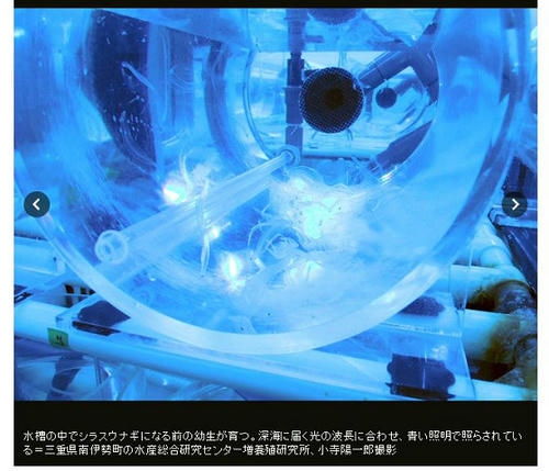 青い光に包まれたひんやりした実験室の水槽で、ニホンウナギの幼生がゆらゆら。